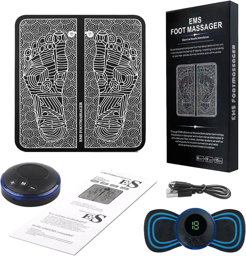 Tapete Masajeador Eléctrico: estimula directamente los músculos de los pies, tobillos y pantorrillas con pulsos eléctricos de baja frecuencia. Tiene 6 modos de masaje y 9 niveles de intensidad, que imitan técnicas como acupuntura, amasado, raspado y ventosas. Perfecto para aliviar hinchazón, fatiga y mejorar la circulación.